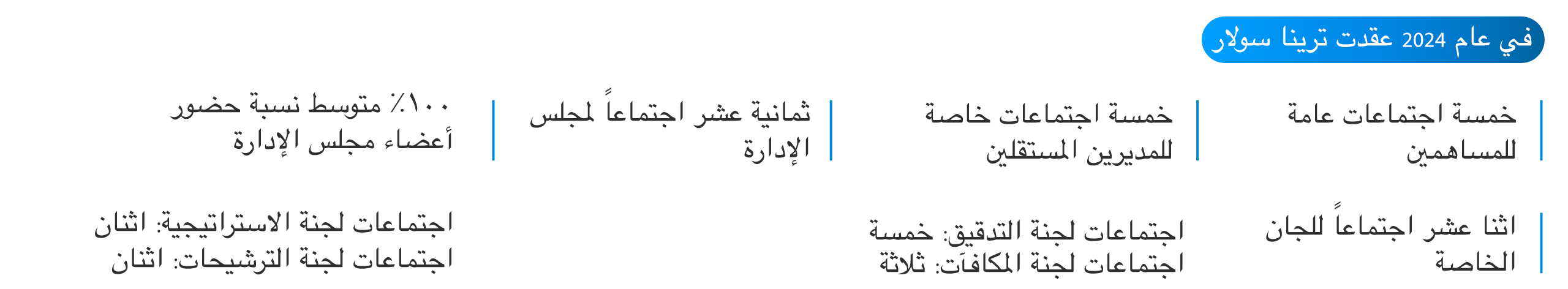 تلتزم شركة ترينا سولار التزاما صارما باجراءات ادارة المديرين المستقلين في الشركات المدرجة ومدونة حوكمة الشركات المدرجة والنظام الاساسي لشركة ترينا سولار وتحافظ على سياسة عمل المديرين المستقلين التي تحدد بوضوح معايير الاهلية ومتطلبات الاستقلالية واجراءات الترشيح والانتخاب والاعفاء وحقوقهم وواجباتهم واليات تقييم ادائهم.