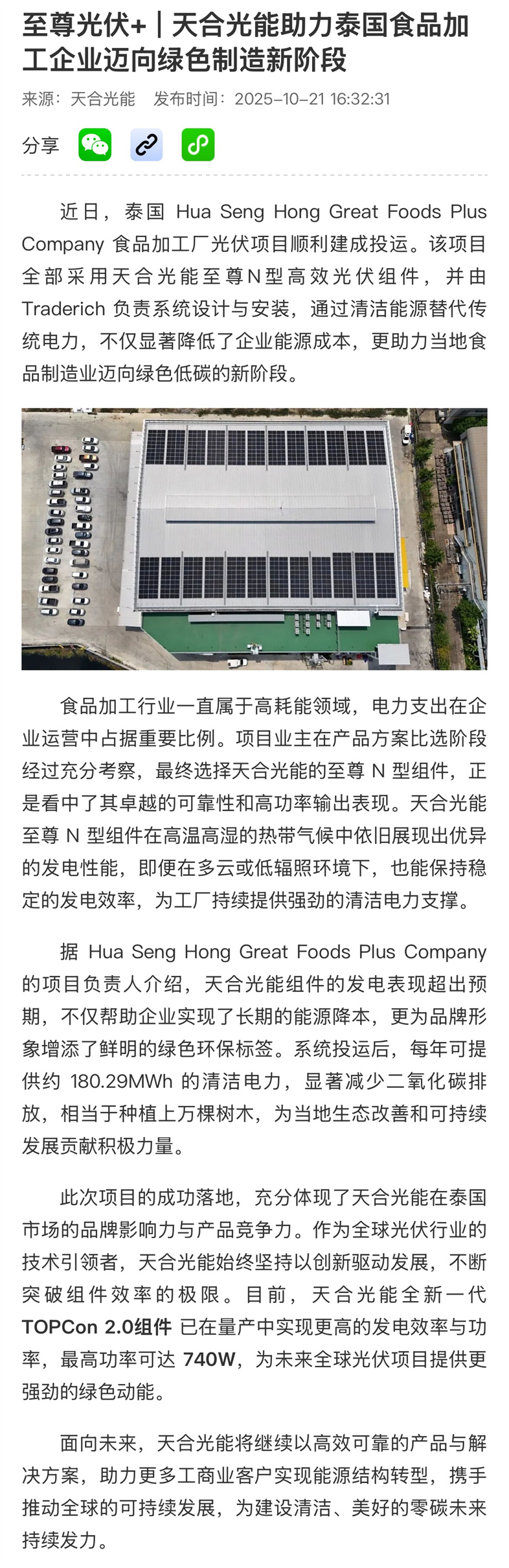 近日,泰国 Hua Seng Hong Great Foods Plus Company 食品加工厂光伏项目顺利建成投运,该项目全部采用天合光能至尊N型高效光伏组件。目前,天合光能全新一代 TOPCon 2.0组件最高功率可达 740W。未来,天合光能将继续以高效可靠的产品与解决方案,助力更多工商业客户实现能源结构转型。受到索比光伏网、特博新能源、风光储网、光伏资讯等媒体关注报道。