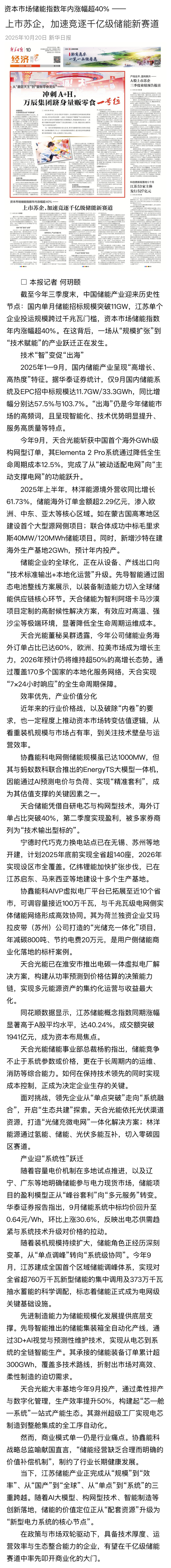 新华日报、江苏商报相继刊发《上市苏企,加速竞逐千亿级储能新赛道》。