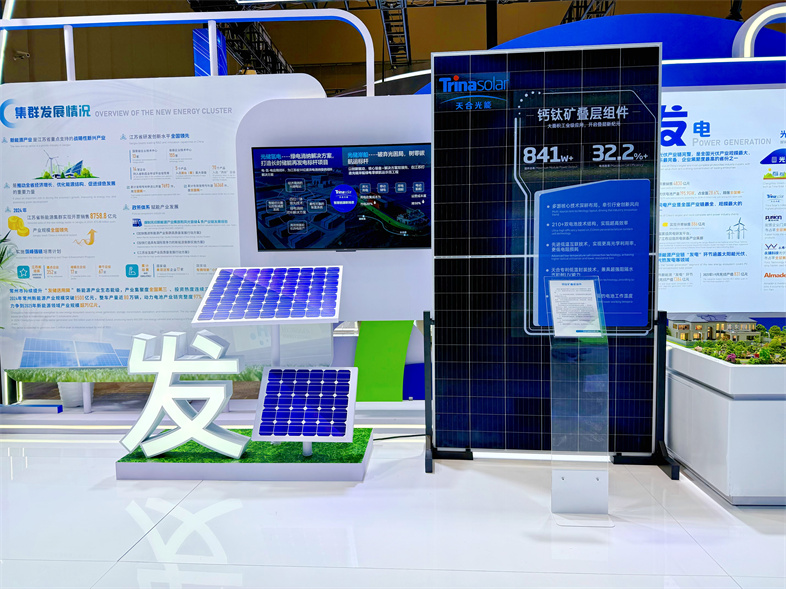 此外,天合光能携841W+超高功率钙钛矿叠层组件、长循环天合芯及新一代Elementa金刚3储能系统等多款产品亮相本次展会。天合光能作为国内最早开展关于钙钛矿叠层研究的企业,今年来已经五次刷新世界纪录。目前,天合光能的钙钛矿/晶体硅两端叠层组件同时兼具低成本和易制备的显著优势。未来2-3年,天合光能将与合作伙伴共同打造规模化的钙钛矿电池产业生态,协力引领叠层时代加速到来。