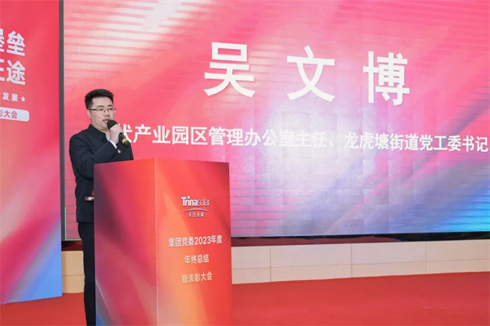 光伏产业园区管理办公室主任、龙虎塘街道党工委书记吴文博对天合光能党委2023年度党建工作表示肯定。他指出,天合光能党委认真落实贯彻上级的决策部署,扎实推进党建引领、人才强企、专利攻关、产业升级等中心工作。新的一年,天合光能党委要强化党建引领,发挥链主优势,推动企业及行业高质量发展。
