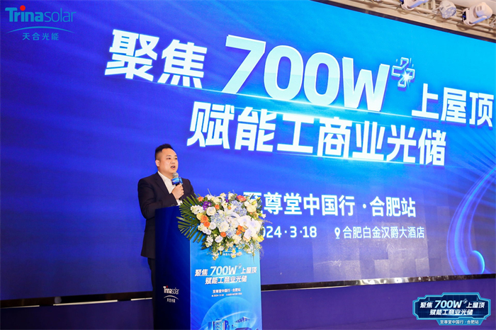 至尊堂搭建沟通桥梁,助力工商业光储发展 天合光能中国区分销安徽省负责人陈志勇为活动致辞。他表示,在领先的光储技术、全面的工商业多场景解决方案加持下,安徽地区工商业光储即将迎来新的开发热潮。希望通过至尊堂中国行·合肥站活动,天合光能可以与安徽地区生态合作伙伴建立起互惠共赢的沟通桥梁,将天合光能更多光储解决方案带到现场,赋能安徽工商业光储跑出发展新速度。
