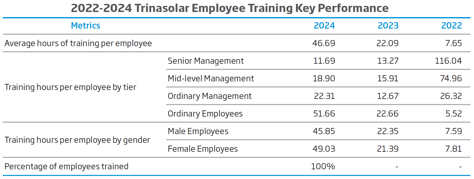 Trinasolar is committed to building a workplace culture of diversity, equity and inclusion. The Company promises to provide equal employment and career development opportunities for all job seekers and employees globally, to attract and retain diverse talents from different regions and backgrounds, bring broad perspectives and professional strength to the Company. To this end, the Company optimizes our employment management system continuously, conducts recruitment management activities based on the four principles of legality, standardization, equity, and professionalism, and resolutely eliminates employment discrimination due to gender, age, region, ethnicity, and other social or personal factors, and gives all candidates fair opportunities to be hired. At the same time, the Company develops a comprehensive talent development mechanism, adopts fair and objective evaluation criteria in performance appraisal, promotion, selection, and training, and gives all employees equal development opportunities, creating a fair and non-discriminatory workplace environment.