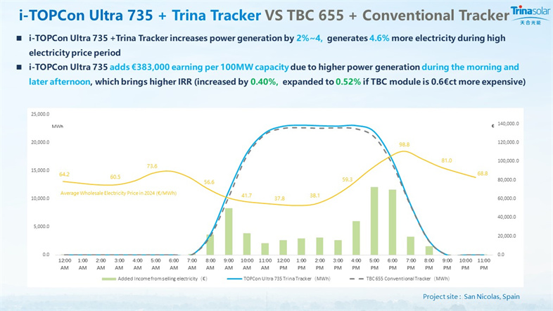System-level assessment further validates the solution's superior performance. On a fixed-tilt structure, the Vertex N i-TOPCon Ultra 735W module delivers 2.97% higher energy yield and 4.03% more generation during high-price hours compared with TBC 655W modules, while lowering LCOE by 2.9%. When paired with TrinaTracker system, this solution achieves 4.6% higher generation during high-price hours than TBC 655W modules with conventional trackers, adds €383,000 earning per 100 MW capacity according to a simulation conducted in San Nicolas, Spain.