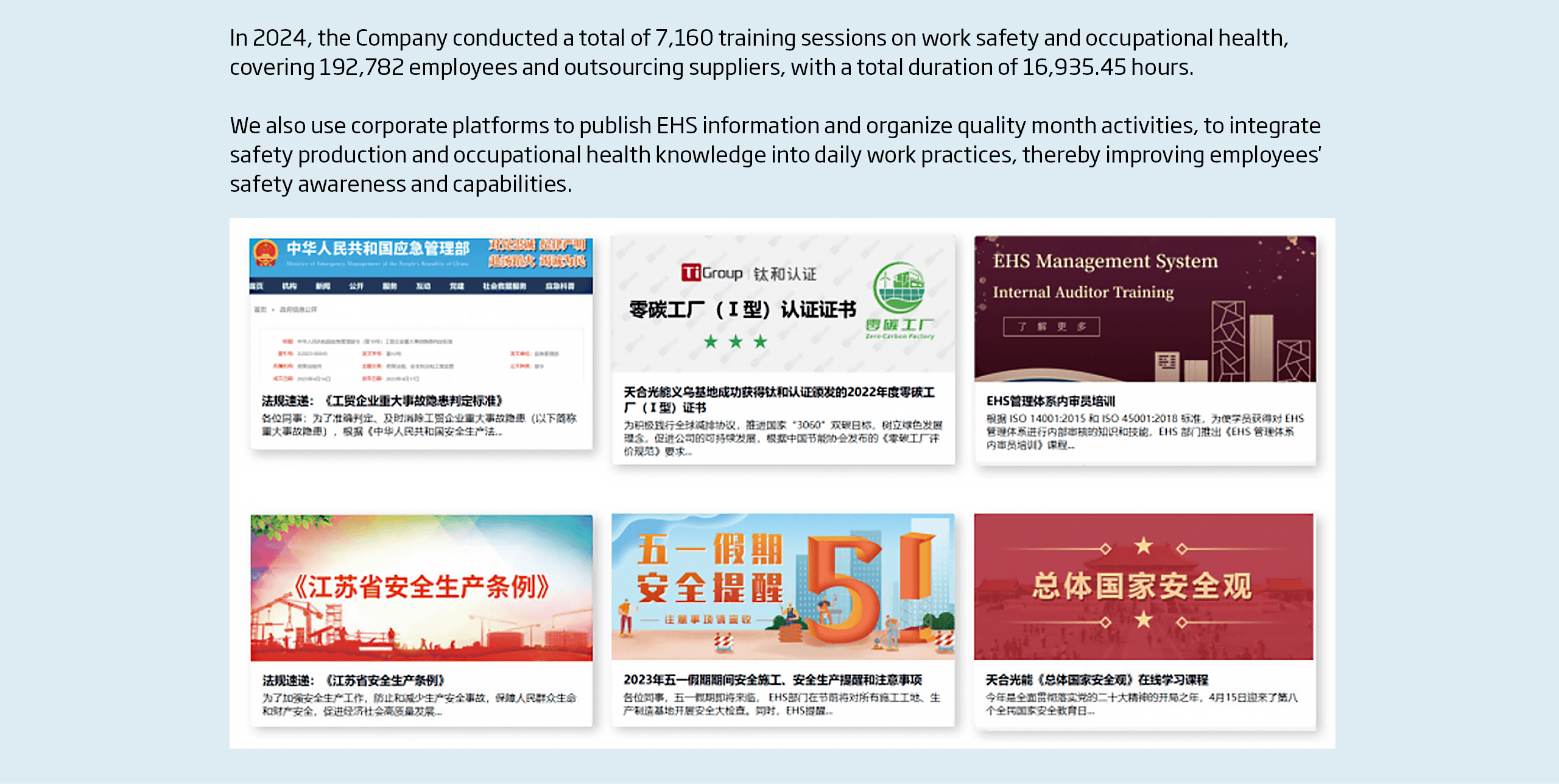 EHS Department: Training on the EHS management system and internal audit, environmental protection, work safety responsibility, etc. Quality Department: Training on the quality management system, interpretation of quality management maturity and corresponding evaluation methods, quality risk management and indicator management, quality management system for internal auditors, refinement and innovation, etc. HR Department: Training on theoretical and practical insight into core values, approaches and practices of role perception, etc |