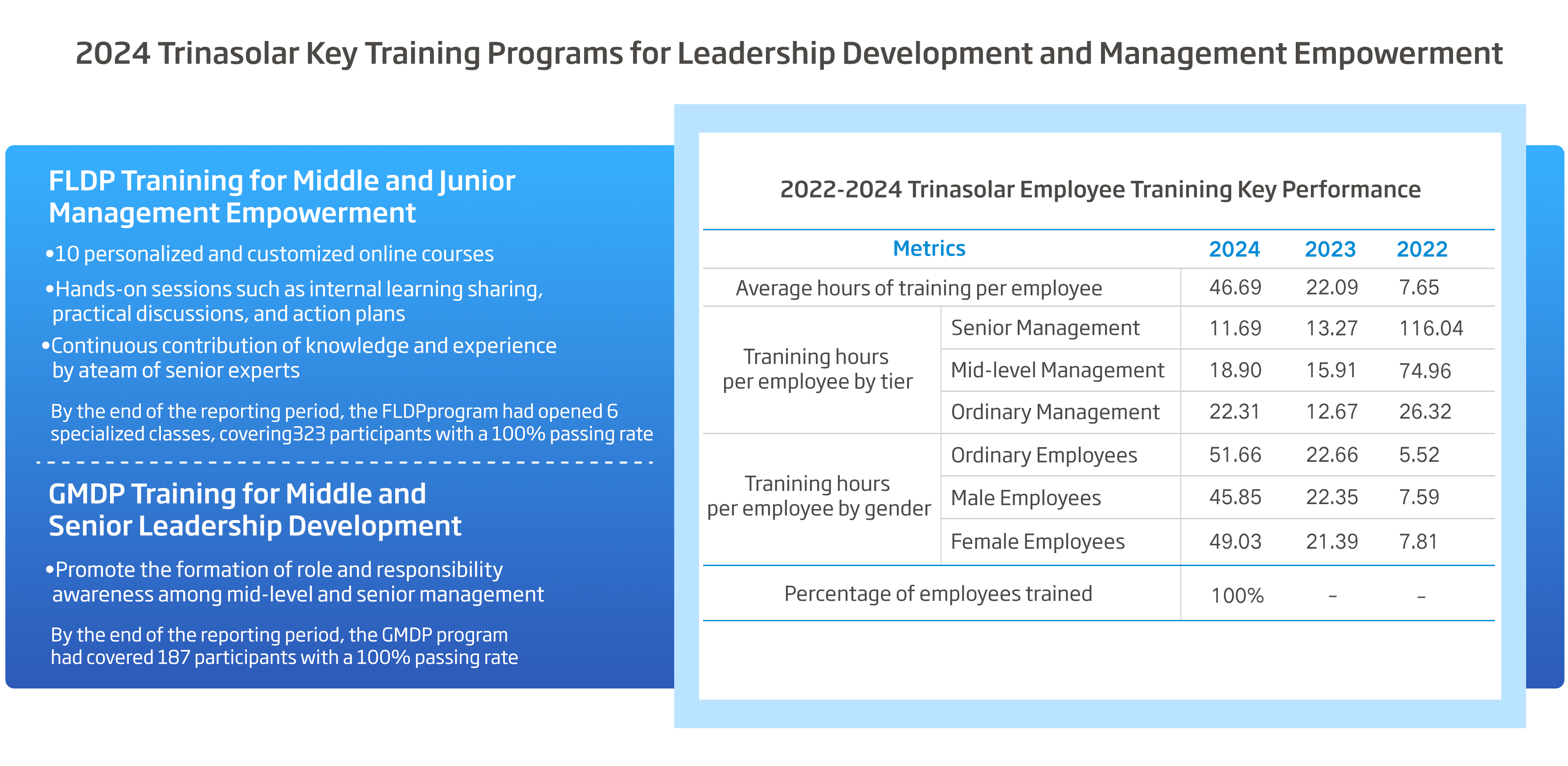 Training on Trinasolar’s core values, efficient execution for managers, Thematic training of “Attitude Is Everything”, customer insight, commercial design and “Organizational Innovation: Outlining a Roadmap to a Market-Oriented and Eco-Friendly Organization” , etc. |