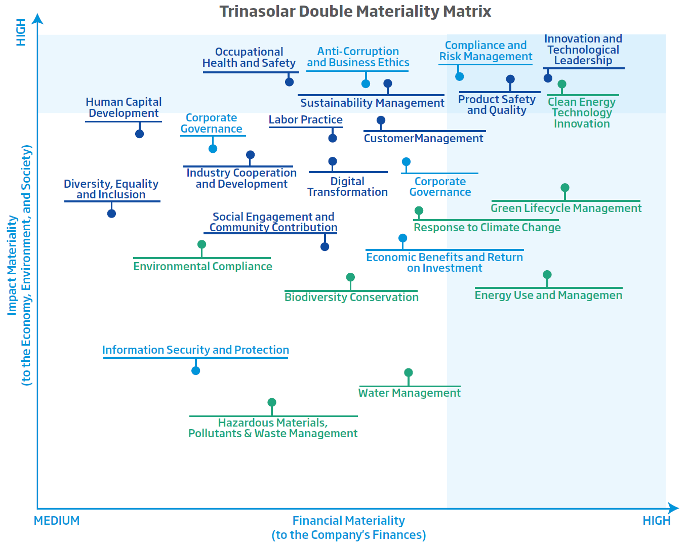 According to the outcome of the materiality assessment, Trinasolar identifies key issues based on their financial and impact materiality. The Company then conducted a thorough review of these issues, assessing their scope of impact, risks, and opportunities. Finally, we highlighted relevant management strategies, measures, and performance, including targets and KPIs, in the Sustainability Report.
