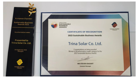 In line with the UN Sustainable Development Goals, the European Chamber of Sustainable Business Awards evaluates companies based on their engagement in sustainable development initiatives and their long-term business impact. The Decarbonisation Leader award aims to create a role model to inspire more companies to reduce carbon emissions, achieve green growth and promote sustainable development. Trina Solar won the award in a highly competitive process with 64 other companies.