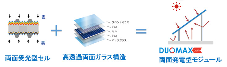 「両面発電モジュール」ともいう。セル両面に電極を備え、裏面でも受光し発電するため、従来型では利用されない地表面からの反射光や散乱光など裏面への入射光も取り込んで発電する。トリナ・ソーラーの両面発電モジュールは こちら 。