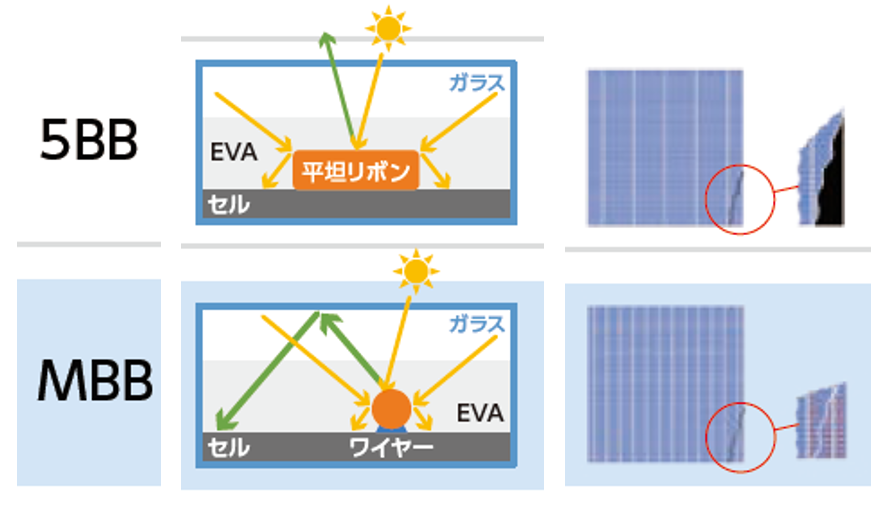 トリナ・ソーラーでは、バスバー電極を従来の5本から9本に増やすことで、電流伝導距離を短くし出力を向上させています。配線材には細いラウンドワイヤーを採用することで受光面積の増加と入射光のセルへの再入射を可能とし、出力をさらにアップ。バスバー電極の本数が多いため、マイクロクラック(微細な割れ)や断線の影響を受けにくくなり、信頼性も向上します。