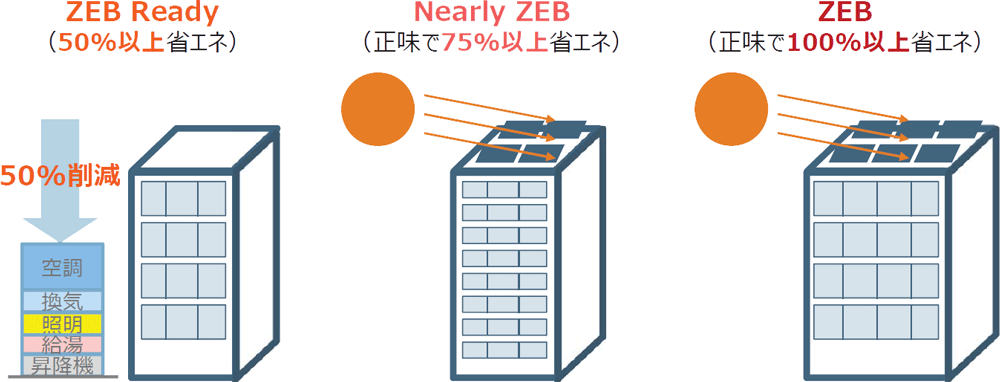 Net Zero Energy Building(ネット・ゼロ・エネルギー・ビルディング)の略。消費する電気やガスといった一次エネルギーを省エネの工夫で削減し、使用するエネルギーを太陽光発電システムなどによって作り出すことで、年間エネルギー消費量をゼロにすることを目指した建物のことです。50%以上の省エネルギー化を実現するZEB Ready(ゼブ・レディ)から取り組み、建物の状態に応じて、省エネや太陽光発電などによる再生エネルギーの創出を向上させることにより、Nearly ZEB(ニアリー・ゼブ/正味75%の省エネ)やZEB (ゼブ/正味100%の省エネ)を目指すことができます。