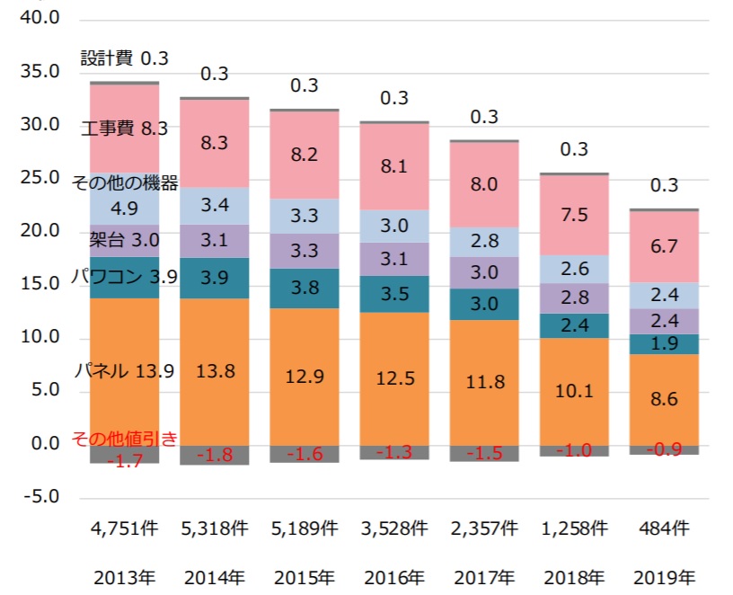 図 設置年別のシステム費用平均値(50kW以上、単位は万円/kW)(出所:経済産業省)
