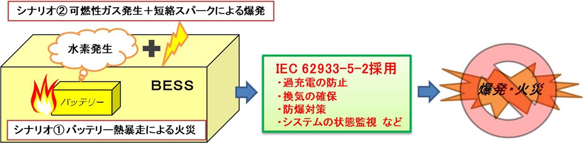 BESSは、再生可能エネルギーの利用拡大に向けて、太陽光発電や風力発電の出力変動に伴う調整力として普及が期待される。その一方、国際的に統一されたBESSの安全基準は未整備の状態であり、実際に火災などの事故が世界各地で発生しているという。