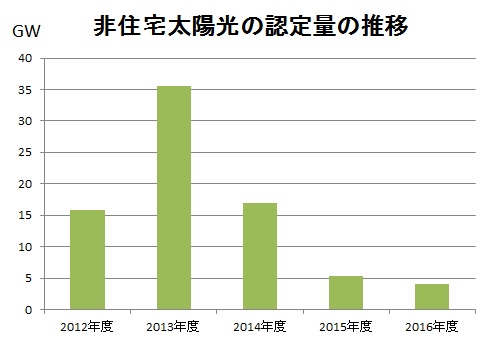 非住宅用の新規認定量は、2013年度の約35GWをピークに2014年度は約17GW、2015年度は約5GWと急減してきたが、2016年度に約4GWとすると、減少のペースは落ちている。