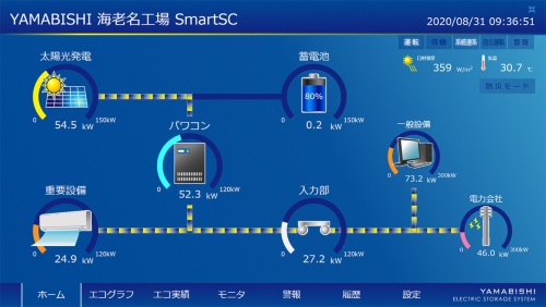 見える化の画面。ホーム画面で太陽光発電、蓄電池、パワコン、使用設備などの関係を示している(図:YAMABISHI)