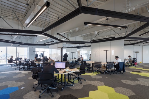 3つの施設で構成したICIラボの中で、中心的な執務空間となっているのがエクスチェンジ棟です。免震を取り入れたうえで、柱が鉄筋コンクリート造、梁が鉄骨造というRCS構造を採用して広い無柱空間を実現しました。自由な席配置やパーティションを兼用したコミュニケーションボードを取り入れたり、ブレインストーミングエリアを設けたりするなど、活発な議論と情報発信を促す場づくりを意図しました。
